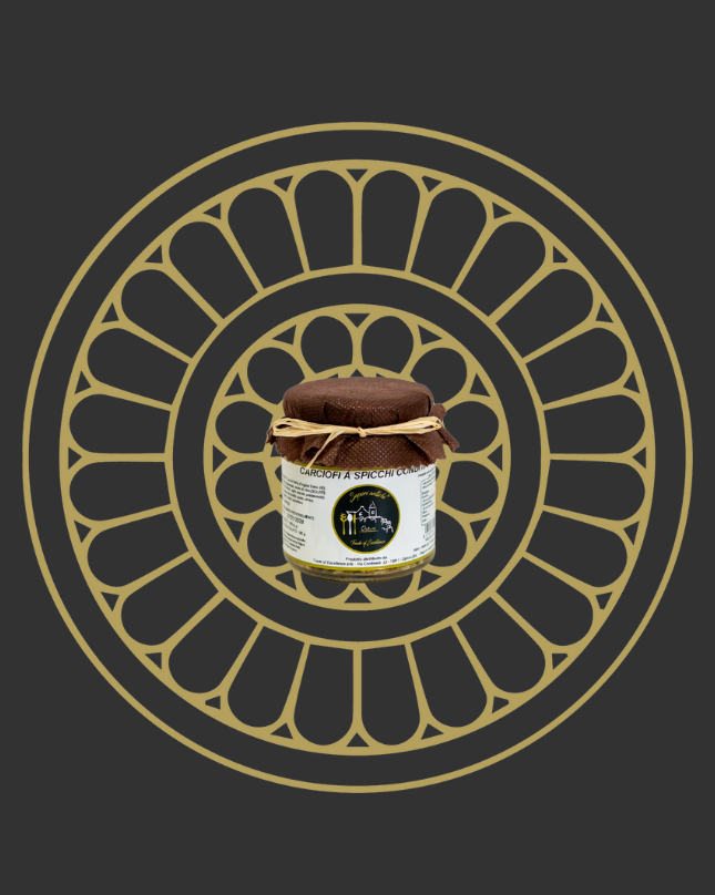 Carciofi c4% di origine Extra europei, olio di semi di girasole, aceto di vino, spezie 2%, sale e correttore di acidità.