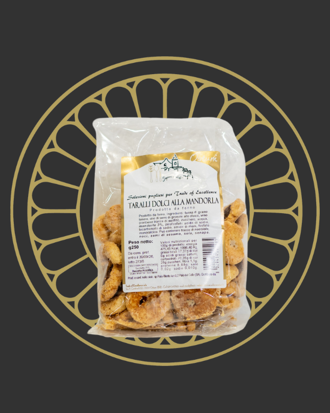 I taralli dolci alla mandorla sono prodotti da forno composti da farina di grano tenero, olio di semi di girasole alto oleico, vino, zucchero, acqua, mandorle 3%, acido di sodio, bicarbonato di sodio, amido di mais. Può contenere tracce di soia, nocciola.