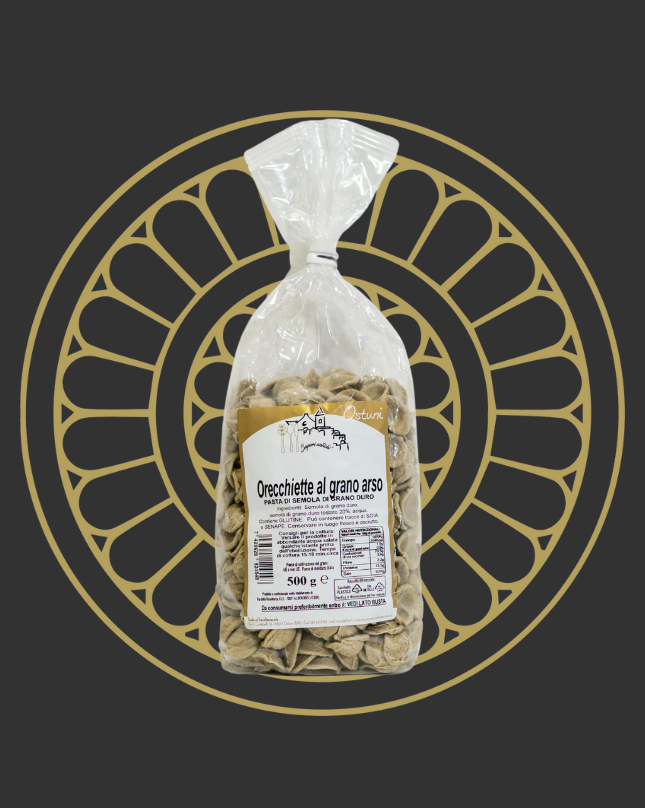Le orecchiette al grano arso sono una pasta di semola di grano duro contenenti semola di grano duro tostato 20%, acqua, glutine e può contenere tracce di soia. Si consiglia di conservare in luogo asciutto e fresco. Inoltre, il tempo di cottura è tra i 12 e i 15 minuti.