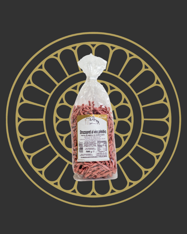 Gli strozzapreti al vino primitivo sono una pasta di semola di grano duro contenenti semola di grano duro, acqua, vino primitivo 14%, bietola rossa 2%, glutine e può contenere tracce di soia. Si consiglia di conservare in luogo asciutto e fresco. Inoltre, il tempo di cottura è tra i 12 e i 15 minuti.