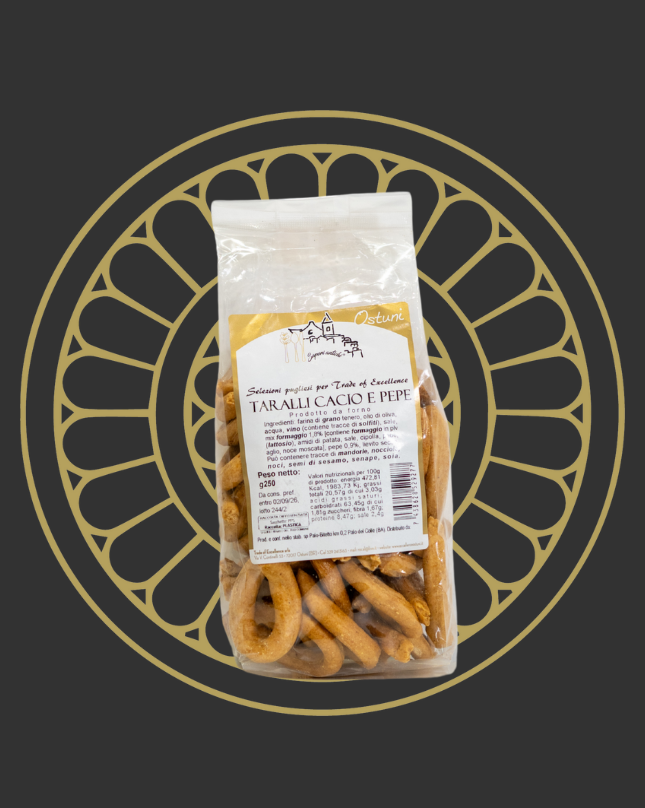 I taralli cacio e pepe reinterpretano un grande classico della cucina italiana in formato snack, con un gusto deciso e irresistibile. Sono perfetti per chi ama sapori forti e autentici e desidera un tarallo con una personalità ben definita.