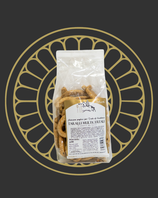 I taralli ai multicereali sono composti da farina di grano tenero, semi di girasole, mix cereali 30%, farina di segale tipo 2, semi di sesamo, semi di lino, farina di orzo, farina di avena, lievito naturale di grano tenero essiccato, sale, farina di grano maltato,antiossidante, olio di oliva, acqua, vino, sale, lievito secco. Possono contenere tracce di soia, frutta a guscio.